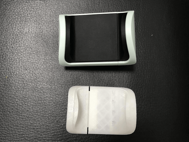 3D打印手機殼白模展示,對比實物圖,可以看得出來,大小尺寸經(jīng)過研發(fā)工程師的修改,更合適配套新款手機尺寸。